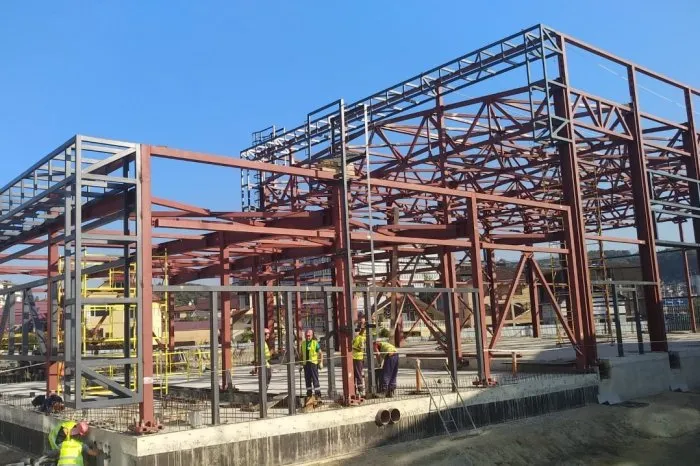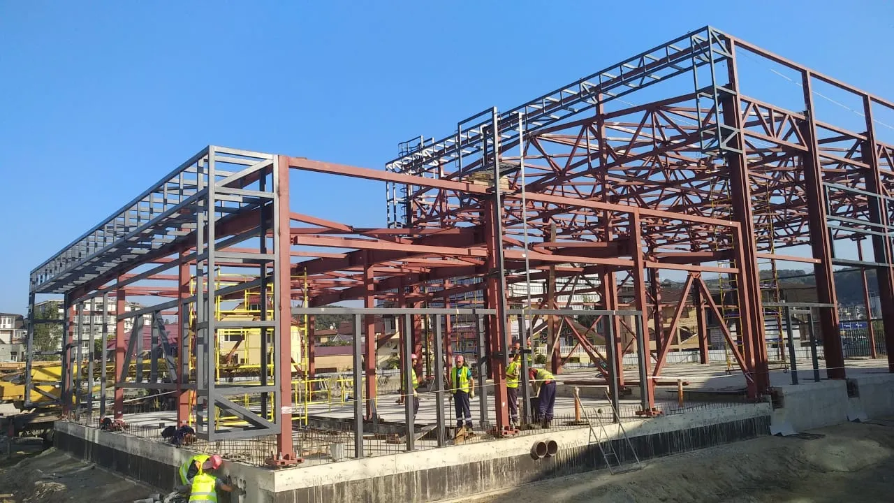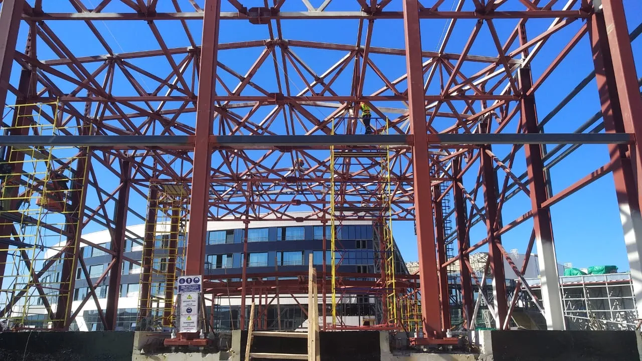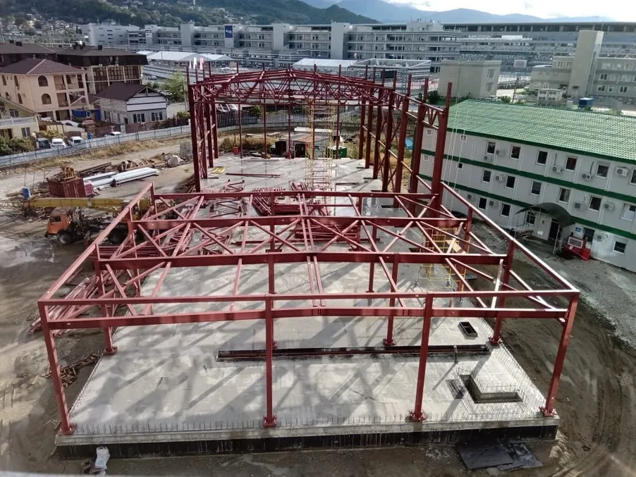 Строящийся центр представляет собой однопролетное здание общей площадью 822 кв.м. В комплект поставки вошли металлоконструкции каркаса здания, а также несущий оцинкованный профилированный настил для покрытия кровли. Ферменный каркас выполнен на основе гнутого замкнутого профиля квадратного сечения, колонны – на основе трубы квадратного сечения и прокатных двутавров, все соединения выполнены на болтах.
